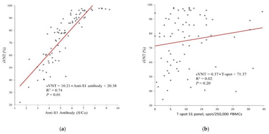 We found a positive linear correlation between nAb and sVNT, which could be explained by nAb being a part of the anti-S1 antibody [14,15,27]. In our study, humoral and cellular immunity were found to be independent (Figure 1b), and this is in line with previous results [5,23,24].