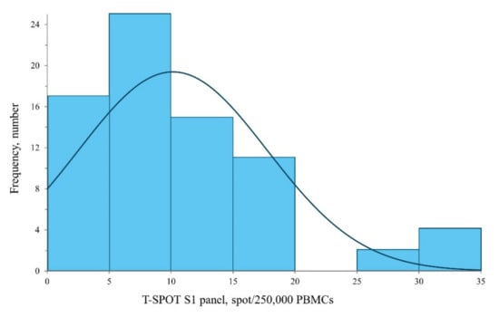 The T-spot Discovery SARS-CoV-2 kit (Oxford Immunotec Ltd., Abingdon, Oxfordshire, UK) was used to confirm cellular immunity. This method is a simplified variant of the ELISpot assay technique. Peripheral blood mononuclear cells (PMBCs) are isolated from a whole blood sample. Subsequently, in response to SARS-CoV-2 antigens, interferon-gamma (IFN-gamma) is secreted from the PMBCs and forms spots which are measured. Two experts in laboratory medicine read the report and averaged the results, with the difference in the number of spots read between the two readers not exceeding three. The T-spot Discovery SARS-CoV-2 kit is composed of four panels: panel 1, panel 3, panel 4, and panel 13, consisting of the SARS-CoV-2 S antigen, nucleocapsid protein, membrane protein, and the high-homology regions of the coronaviruses, respectively. For the quantitative determination of the T-spot, the value obtained by subtracting the number of nil control spots from the number of panel 1 (S antigen) spots was considered the index. Although the T-spot Discovery SARS-CoV-2 kit did not provide a cut-off point, we considered 10 spots/250,000 PBMCs or more to be positive, as suggested in a previous study that defined the cut-off point as the number of spots of mean + 3 standard deviations of the uninfected and unvaccinated population [22].