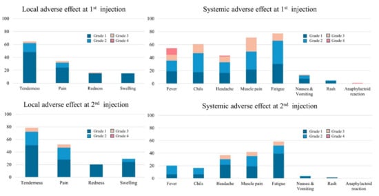 AEs following the first and second injections were investigated using questionnaires and evaluated in terms of the severity and the intensity. The AEs identified included four local and eight systemic outcomes. Local side effects included tenderness, pain, redness, and swelling. Systemic side effects included fever, chills, headache, myalgia (muscle pain), fatigue, nausea and vomiting, rash, and anaphylaxis (or anaphylactoid reaction). All participants were interviewed about their questionnaires by laboratory physicians and special circumstances, such as outpatient visits to hospitals and hospitalizations, were identified. The intensity of the AEs was subjectively graded from 0 to 4:0 (none), 1 (mild; did not affect daily or occupational activities), 2 (moderate; affected daily or occupational activities), 3 (severe; daily or occupational activities impossible), and 4 (very severe; life-threatening, admission, or death), based on the Food and Drug Administration’s guidance for toxicity grading scales for vaccines [17]. In addition, one point was added if the individual experienced a high fever (≥39 °C) or vomited more than twice. Finally, to integrate the severity and the duration of the AEs, the sum of reactogenicity intensity (SRI) and sum of reactogenicity intensity and duration (SRID) were calculated using the following formula [15].