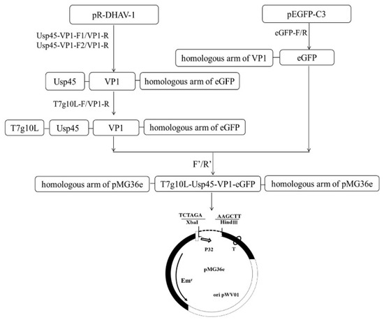 The primers used in this study are listed in Table 1. Using plasmid pR-DHAV-1 as template, the first fragment of 781 bp was amplified with primers Usp45-VP1-F1/VP1-R. The second fragment of 818 bp, with an 81 bp signal peptide, was amplified using the first fragment as template with primers Usp45-VP1-F2/VP1-R. Using gel extract production in the second step as the template and T7g10L-F/VP1-R as primers, an 840 bp fusion gene T7g10L-Usp45-VP1 with homologous arm of eGFP was obtained. Using plasmid pEGFP-C3 as template, a fragment of 816 bp with homologous arm of VP1 was amplified with primers eGFP-F/eGFP-R. The T7g10L-Usp45-VP1 and eGFP were fused together with primers T7g10L-F/eGFP-R and linked to the vector pMD18-T to be sequenced. Then, the homologous arm of vector pMG36e was added to the T7g10L-Usp45-VP1-eGFP with primers F’/ R’ and the final 1612 bp fragment was inserted to plasmid pMG36e with the restriction enzyme Xba I and Hind III. The recombinant plasmid was transformed into the E. coli DH5α competent cells, and the positive clones were sequenced by Sangon Biotech Co., Ltd. (Shanghai, China) (Figure 1).