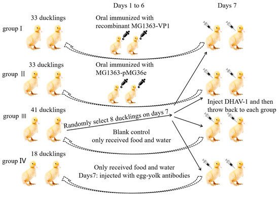 A total of 130 one-day-old cherry valley ducklings were bought from Jingwei husbandry company, Taian city. Five one-day-old ducklings were randomly slaughtered to collect serum and intestine samples. The remaining ducklings were divided into four groups, named group I (33 ducklings), group II (33 ducklings), group III (41 ducklings), and group IV (18 ducklings). Ducklings in group I and group II were orally immunized with L. lactis MG1363-VP1 and L. lactis MG1363-pMG36e, respectively, from day 1 to day 6. Each duckling in the two groups was orally immunized with 1 mL (1 × 109 CFU/mL). The five ducklings were randomly slaughtered at 3, 5, and 7 days, after 48 h, 96 h, and 134 h of oral immunization, to collected serum and duodenum. Group III were given food and water only as a blank control group and were also slaughtered at the same time. Ducklings in group IV only received food and water and were then injected with egg-yolk antibodies (1 mL/duckling) at 7th day. Finally, on the day 7, 8 ducklings were randomly selected from group III to infect with DHAV-1 (strain LY0801) through the eyes and nose (0.3 mL/duckling; 2 × 104 copies). Next, each group was put in 2 ducklings infected with DHAV-1 to mimic natural infection (Figure 2). From day 8, the surviving number of ducklings in each group was recorded.