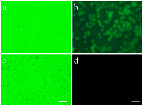 The results of fluorescence microscopy: (a) bright field of MG1363-VP1; (b) fluorescent field of MG1363-VP1; (c) bright field of MG1363-pMG36e; (d) fluorescent field of MG1363-pMG36e. (Scale size: 20 μm).