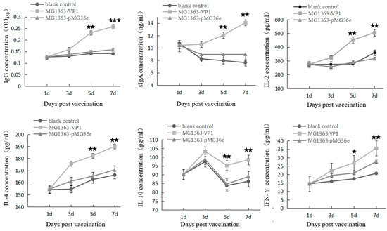 The IL-2, IL-4, IL-10, IFN-γ, total sIgA, and anti-VP1 antibody were detected at 3, 5, and 7 days. One-way analysis of variance multiple range test in GraphPad prism5 was used to analyze data. Statistical significance of p-values < 0.05 was set (Figure 5). The concentrations of IgG, sIgA, IL-2, IL-4, and IFN-γ in ducklings of MG1363-VP1 were significantly higher than those in ducklings of MG1363-pMG36e and the blank control group on days 5–7. The concentration of IL-10 in MG1363-VP1 group rose to the peak at the third day; it then went down and rose again.