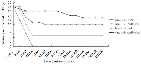 The infection period in this study mimicked the natural infection for 15 days. All ducklings in the blank control group died on the fourth day after infection; the final mortality rate reached 100%. At the same time, the ducklings that were orally immunized with L. lactis MG1363-pMG36e died faster after infection; there were 13 deaths in 4 days, and the final survival rate was 27% (5/18). Different from the blank control group, the MG1363-pMG36 control group is partially protective. The ducklings that were orally immunized with L. lactis MG1363-VP1 no longer died after 6 days of infection, and the final protection rate was 55% (10/18). In the egg-yolk antibodies group, only two ducklings died within 4 days after infection, and there was no death thereafter, the final survival rate was 72% (13/18) (Figure 6).