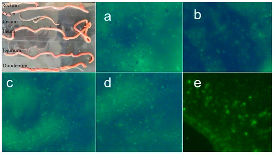 Fluorescence microscopy of intestinal mucosal epithelial contents: (a) duodenum; (b) jejunum; (c) ileum; (d) cecum; (e) colon.