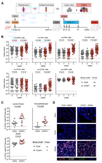 All umbilical cord blood samples were processed and stored in two fractions: CD34+ hematopoietic stem cells (HSCs) and mononuclear umbilical cord blood cells (UCBCs) (Figure 1A). For generating CD34 mice, newborn NOD-Rag1null IL2rgnull (NRG) mice were irradiated and injected with CD34+ HSCs and analyzed by FACS at 12 weeks of age to confirm the presence of human cells in peripheral blood (Figure 1A). To generate CD34T+ mice, 13–40 weeks old CD34 mice were injected with donor-matched UCBCs and four doses of 250 ng human IL-7, which is reported to help homing of T cells to the gut [,] (Figure 1A). We compared CD34T+ mice before (week 0) and after (week 2) UCBC injection, along with a control group of CD34 mice for changes in human leukocyte levels (FACS gating strategy in Supplementary Figure S1A). CD34T+ mice showed increased absolute levels of human CD45+ cells and the primary lymphocyte population to undergo expansion was CD3+ T cells and included both CD4+ and CD8+ T cell populations. In addition, we observed a significant increase in CD16+ cells in CD34T+ mice, while CD19+ B cells and mouse CD45+ leukocytes did not show significant changes after 2 weeks (Figure 1B, Supplementary Figure S1B and Table S1). In the CD34 control group, levels of all analyzed human and mouse cell populations remained similar over time (Figure 1B, Supplementary Figure S1B and Table S2). Our analysis encompassed 18 umbilical cord blood donors, confirming that CD34T+ mice can be successfully generated from different donors (Supplementary Figure S1C). These data show that the CD34T+ mice exhibit high T cell reconstitution in the peripheral blood. Next, we also tested non-humanized NRG mice using this treatment regimen and injected either neonatal UCBCs or adult PBMCs, since donor mismatch was not a concern in this case (Supplementary Figure S2A). UCBC reconstitution alone did not result in high levels of peripheral blood T cells (Supplementary Figure S2B). The levels of leukocytes in NRG-PBMC mice were similar to CD34T+ mice, however, NRG-PBMC mice developed very rapid GvHD with symptoms including hunched posture, fur loss, and reduced mobility [] (Supplementary Figure S2B). Thus, CD34T+ mice were deemed the most appropriate model system for achieving high human cell expansion.