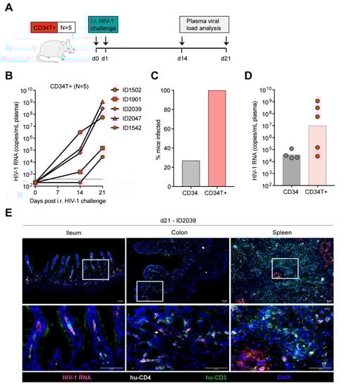 3.3. CD34T+ Mice can Efficiently Transmit HIV-1 Across the Gut Mucosa