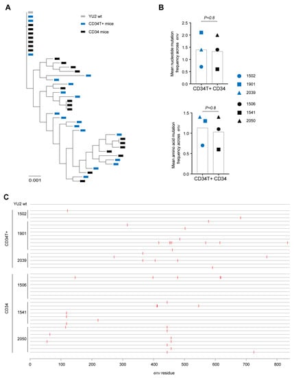 In contrast to CD34 mice, in CD34T+ mice, i.r. challenge with the same NL4-3YU2 HIV-1 stock all mice became infected, exhibiting 100% success rate (Figure 2A–C). Moreover, mean plasma viremia of ~106 HIV-1 RNA copies/mL at week 3 in CD34T+ mice (Figure 2D) is comparable to early stages of infection in humans []. HIV-1 RNAscope staining revealed infected human CD4+T cell reservoirs in both GALT and spleen sections from CD34T+ mice (Figure 2E). The vast majority of HIV-1 RNA positive cells were human CD3+ T cells co-expressing human CD4, with few HIV-1 RNA positive cells only expressing only human CD4 (Figure 2E). In order to analyze the sequence of the viruses that were transmitted across the mucosal membrane, we performed single genome sequence (SGS) analysis of single virions isolated from the plasma of infected mice. SGS and phylogenetic analysis of plasma virions revealed no significant differences in mutational load when comparing i.r. challenge in CD34T+ mice and i.p. challenge in CD34 mice (Figure 3A,B). Thus, CD34T+ mice show similar levels of env gene diversification compared to CD34 mice despite the high levels of viral replication (Figure 3C). In summary, these data show that CD34T+ mice efficiently infected following mucosal HIV-1 challenge and can hence be used for mucosal HIV-1 transmission studies.