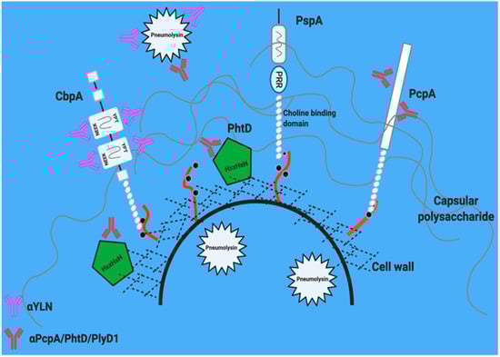 As a vaccine candidate, the expression of pspA is constitutive and among those genes with the highest level of expression across five distinct anatomical sites: the nasopharynx, lungs, blood, heart, and kidneys of infected mice by three distinct strains of Spn [54]. Thus, it is a valid protective antigen candidate for antibody-mediated opsonization. In numerous animal studies of immunization followed by direct Spn challenge, antibodies against PspA were sufficient to confer protection [83,84]. The N-terminal domain of PspA is composed of numerous alpha-helices and has considerable variability, sufficient to divide the protein into distinct serological-based clades [85,86]. Protective antibodies can be clade specific or directed to the conserved proline-rich domain found in the majority of PspA versions. Passive protection against pneumococcal sepsis in mice was also seen using antibodies generated from a human clinical safety trial [84,87].
