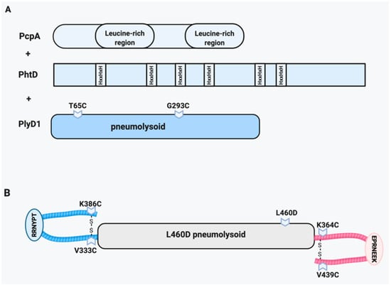 Multivalent protein formulations. (A) The PcpA, PhtD, PlyD1 multivalent vaccine consisting of recombinant PcpA and PhtD along with the PlyD1 pneumolysin toxoid. (B) YLN hybrid construct consisting of the YPT and NEEK conserved domains of CbpA fused with the N- and C-teriminus, respectively, of the inactive L460D pneumolysin toxoid. 6.1. PcpA/PhtD/pneumolysin toxoid multivalent vaccine.