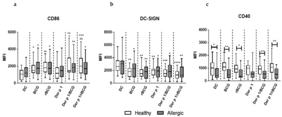 During maturation, DCs coordinately regulate antigen capturing, processing and presentation, as well as the expression of co-stimulatory molecules and cytokine production [20]. To examine whether the allergic status affects the maturation of MD-DCs induced in vitro with BCG or rBCG-hIL-18 in the presence of Der p 1, we analyzed by flow cytometry the DC-surface expression of various co-stimulatory molecules and surface receptors that play an important role in the DC–T cell interaction. MD-DCs from allergic patients and healthy donors were pulsed with BCG or rBCG-hIL-18, alone or in the presence of Der p 1. The characteristics of blood donors are presented in Table S1. A total of 10,000 events were collected in the gates. The MFI of CD86, CD80, HLA-DR, CD40 and DC-SIGN, as well as the percentages of the cells gated on the FSC/SSC spectrum, were determined for allergic patients and healthy donors. The percentages of gated cells were similar in each experiment, and the values ranged from 82 to 90%. Both for allergic patients and healthy donors, BCG and rBCG-hIL-18, with or without (+/−) Der p 1, significantly upregulated the expression of CD86 compared with unstimulated DCs or DC incubated with Der p 1 alone (Figure 1a). In parallel, a significant decrease in DC-SIGN expression was observed upon incubation with BCG or rBCG-hIL-18, +/− Der p 1 compared to unstimulated DCs in allergic patients and in healthy donors (Figure 1b). No significant differences between healthy controls and allergic patients were noted for CD86 and DC-SIGN expression. This was unlike CD40, which was significantly less expressed on the surface of DCs from allergic patents compared to healthy controls, regardless of the presence of either BCG strain (Figure 1c). No significant alternation in CD80 and HLA-DR expression on MD-DCs stimulated with mycobacteria alone or in the presence of Der p 1 was found in either group of donors. (Figure S1). There was no difference between BCG- and rBCG-hIL-18-stimulated cells for any of these markers.