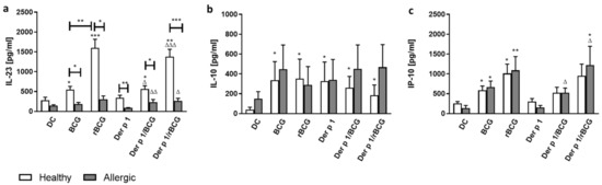 IL-23 (a), IL-10 (b) and IP-10 (c) production by stimulated MD-DCs from allergic patients and healthy donors. Human MD-DCs were stimulated with BCG (1:1), rBCG-hIL-18 (rBCG) (1:1), Der p 1 (1 μg/mL), Der p 1/BCG or Der p 1/rBCG for 24 h or were left unstimulated (DC). The cytokine (IL-23, IL-10) and chemokine (IP-10) levels in culture supernatants were measured in duplicate by ELISA. Data shown represent the medians ± SEM for 22 allergic patients and 40 healthy donors. Statistical analyses were performed by using the Mann–Whitney U test for unpaired data. * p < 0.05; ** p < 0.01; *** p < 0.001 versus control (unstimulated DC), unless indicated by the horizontal bars, Δ p < 0.05; ΔΔ p < 0.01; ΔΔΔ p < 0.001 versus Der p 1.
