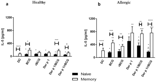 Secretion of IL-5 by human naive T cells (a) and memory T cells (b) following 96 h coculture with BCG- (1:1), rBCG-hIL-18 (rBCG)- (1:1), Der p 1- (1 μg/mL), Der p 1/BCG- or Der p 1/rBCG-pulsed autologous MD-DCs (ratio MD-DCs/T cells, 1:10). The cytokine levels in the cocultures were measured in duplicate by ELISA. Data shown are the medians ± SEM for 22 allergic patients and 40 healthy donors. Statistical analyses were performed by using the Kruskal–Wallis test for unpaired data. * p < 0.05; ** p < 0.01; *** p < 0.001; **** p < 0.0001 versus control (unstimulated DC), unless indicated by the horizontal bars; Δ p < 0.05 versus Der p 1.