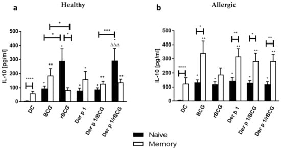Secretion of IL-10 by human naive T cells (a) and memory T cells (b) following 96 h coculture with BCG- (1:1), rBCG-hIL-18 (rBCG)- (1:1), Der p 1- (1 μg/mL), Der p 1/BCG- or Der p 1/rBCG-pulsed autologous MD-DCs (ratio MD-DCs/T cells, 1:10). The cytokine levels in the cocultures were measured in duplicate by ELISA. Data shown are the medians ± SEM for 22 allergic patients and 40 healthy donors. Statistical analyses were performed by using the Kruskal–Wallis test for unpaired data. * p < 0.05; ** p < 0.01; *** p < 0.001; **** p < 0.0001 versus control (unstimulated DC), unless indicated by the horizontal bars; ΔΔΔ p < 0.001 versus Der p 1.