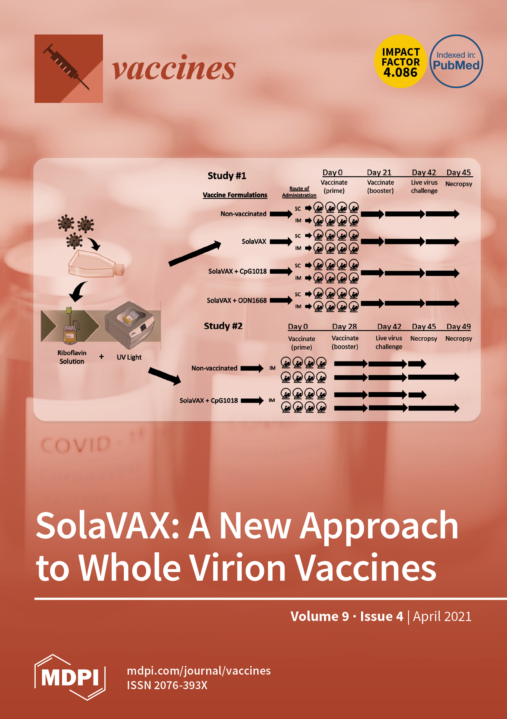 Cover Story: We report on the use of a novel method (SolaVAX) for production of an inactivated vaccine candidate and the testing of that candidate in a well-characterized hamster model for its ability to prevent infection upon challenge with SARS-CoV-2 virus. The results from this preliminary evaluation provide insight into the immunological responses that occur following vaccination and the outcomes of vaccine efficacy and protection against infection following challenges with live SARS-CoV-2. These data may have utility in the development of effective vaccine candidates against emerging viral pathogens. Furthermore, the results of this preliminary evaluation suggest that preparation of a whole virion vaccine for COVID-19 using this specific photochemical method may have potential utility in the preparation of one such vaccine candidate. View this paper.