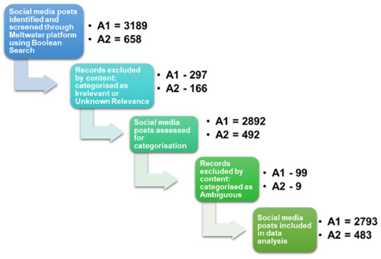 Study limitations were mainly because of analysis timing, which was situated within the period of the coronavirus (COVID-19) pandemic. Naturally, COVID-19 received a considerable amount of digital and social media attention [29], with the mention of vaccines proving to be problematic within Annoucement-1 (Figure 1a). This was remedied by further tailoring of the Boolean search for Announcement-2 (Figure 1b). As only one researcher performed data categorization and analysis and no inter-rater reliability procedure was performed, this analysis was dependent on researcher subjectivity and interpretation of digital and social media content. Insights into the opinions within the digital and social media posts are based on reader observation and analysis of the social conversations, thus, to minimize bias, inclusion and exclusion criteria were used for categorization (Table 1). Digital and social media posts extracted from Meltwater are not representative of the UK population’s perceptions but focuses on media ‘noise’ that refers to online exposure and should be interpreted as such. Furthermore, content from private users is not accessible, consequently, information is revealed at the individual’s discretion. No quantitative analysis was performed due to the inability to assign both pre- and post-Announcement-1 and Announcement-2 participants, resulting in unpaired and independent categories.