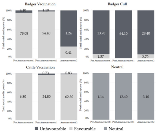 Bar graphs demonstrating the percentages of the total number of relevant digital and social media posts that were categorized as either unfavorable, favorable or neutral in reference to the topics of badger vaccination, badger culling, cattle vaccination, or neutral for the periods: pre-Announcement-1; post-Announcement-1; and Announcement-2.