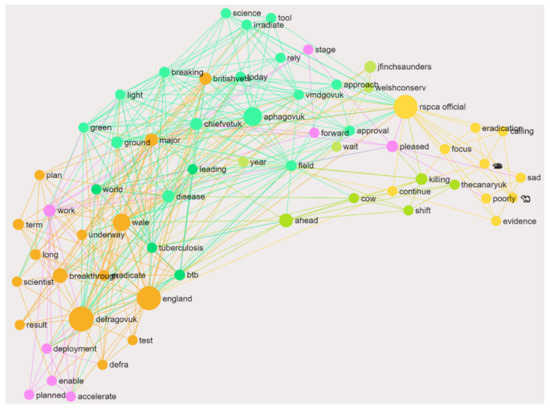 InfraNodus graphical visualization of the communication gap between the cattle vaccine favorable (CVF) for Announcement-2 and post-Announcement-1. Data present in Announcement-2 CVF, but absent in post-Announcement-1 CVF. Different colors represent different topical clusters that are connected, whilst lines show the connections between different words and clusters. Each word is represented by a node, with the node size changing depending on its level of influence on other words around it. For example, in this social network analysis, defragovuk was absent in Announcement-1, but present in Announcement-2 where it has a large orange node. This shows it is highly and diversely connected to other words and therefore has a greater overall influence on them and, upon detailed analysis, was found to influence the positive sentiment directed towards the bovine tuberculosis (bTB) cattle vaccine.