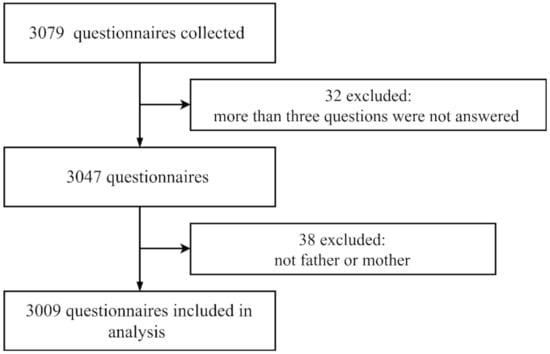 Of the 3079 questionnaires collected, 3009 questionnaires were included in the analysis (Figure 1). The average participant age was 31.36 years old, and 74.6% were mothers (Table 2). Overall, 69.7% had a college degree or above, and 93.8% did not have a healthcare occupation.