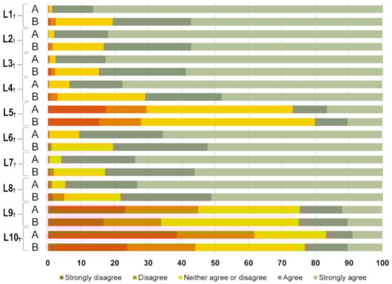 The mean ± SD category A VHS scores were significantly higher than the category B VHS scores (40.96 ± 3.87 vs. 38.58 ± 5.05, p = 0.000). For items L1–L4 and L6–L8, parents showed more agreement on category A vaccines than category B vaccines (Figure 2). Overall, 0.5% and 6.8% of parents were “high hesitant” about category A and B vaccines, respectively, when the cutoff was ≤30. When the cutoff was ≤40, 46.5% and 64.5% of parents were “high hesitant” about category A and B vaccines, respectively. The fathers’ scores were also significantly higher than the mothers’ scores for category A and B VHS (Table S1).