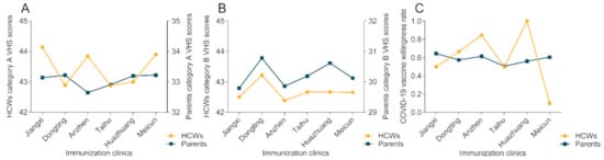 Data were reported using descriptive statistics. Normally and non-normally distributed continuous variables were analyzed using the t-test and the Mann–Whitney U test, respectively. Meanwhile, categorical variables were compared using the Chi-square or Fisher’s exact test. The Spearman correlation was used to describe the relationship between VHS scores and vaccination willingness. Meanwhile, we reported the relationship between VHS scores and vaccination willingness between HCWs and parents divided by immunization clinics (using mean values).
