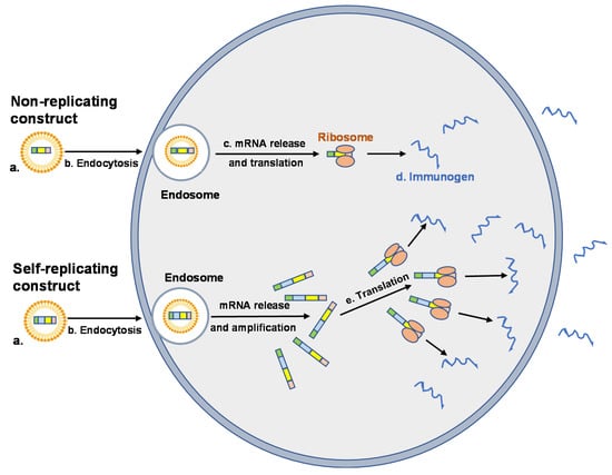 Self-replicating constructs are much larger than nonreplicating mRNA constructs (i.e., 9.3 versus 2.2 kb), making production and stability more challenging and possibly limiting vaccine internalization [,]. They tolerate few nucleotide modifications or sequence alterations without losing self-amplifying activity []. Moreover, self-replicating constructs include unrelated antigenic proteins (i.e., the RDRP complex) capable of inducing a strong immune response that suppresses translation and immunogen production. Furthermore, double-stranded RNA intermediates formed during self-replication are the natural ligands of cytoplasmic RNA sensors RIG-I and melanoma differentiation-associated protein 5 (MDA5). Ligation by these receptors initiates the release of type I interferons (INFα/β) and activation of the interferon response gene cascade and innate immunity []. In fact, it has been suggested that the strong intrinsic adjuvant activity of self-replicating mRNA contributes to its higher immunogenicity at lower doses compared to nonreplicating mRNA constructs [,]. Notably, whether a type I INFα/β response is beneficial or detrimental to the generation of vaccine-induced immunity is a matter of ongoing discussion [,]. Consequently, IFNα/β production should be considered in the design of any mRNA vaccine given evidence to support the ability of IFNα/β to both enhance and inhibit protective immunity [].