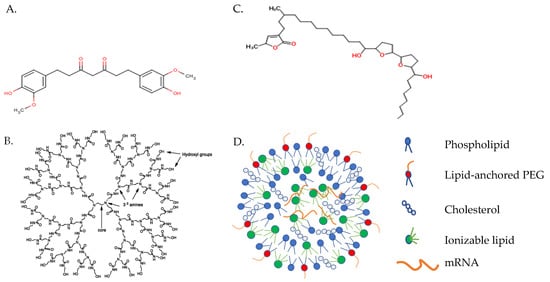 mRNA-based vaccine carriers. (A) Diethylaminoethyl-dextran; (B) cationic polyamidoamine dendrimer; and (C) protamine. Images captured from PubChem (https://pubchem.ncbi.nlm.nih.gov, accessed on 8 April 2021) (D) Lipid nanoparticle.