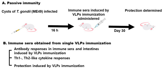 As seen in Figure 1A, naïve mice were infected with T. gondii (ME49), and immune sera were intravenously administered after 16 h. In order to determine protection, the bodyweight and survival rate of the mice were monitored, and cyst counts were determined at 30 dpi. As seen in Figure 1B, the immune sera for passive immunization were obtained from a single VLP immunization. The parasite-specific antibody responses in sera and intestines, Th1- or Th2-like cytokine responses, and protection were determined as scheduled.