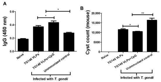 In conclusion, our results demonstrated that a single immunization with the TG146 VLPs induced the production of neutralizing antibodies, conferring protection against T. gondii in mice. Passively immunizing mice with the sera of VLP-immunized mice revealed that the sera were protective irrespective of the adjuvant inclusion. Formulating CpG adjuvants with TG146 VLPs enhances the parasite-specific IgG, IgG subclass, and IgM antibody responses, thereby indicating their potential as a passive immune therapeutic option.