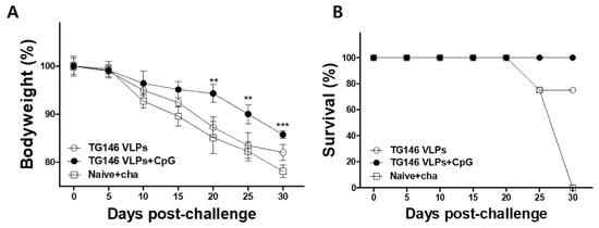 Passive immunization using the sera from VLP-immunized mice conferred protection against parasite infection. Naïve mice were infected with a lethal dose of T. gondii (ME49), and immune sera from VLP-vaccinated mice were injected into the tail vein. Their body weight change (A), and survival rate (B) were determined. The sera from adjuvanted VLPs showed better protection compared to those from unadjuvanted VLP immunization. The data are expressed as mean ± SD, and statistical significance is denoted using asterisks (** p < 0.01, *** p < 0.001).