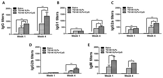 IgG, IgG subclasses, and IgM antibody responses in sera. Sera collected from mice post-immunization were used to assess the T. gondii-specific antibody responses. The levels of IgG (A), IgG1 (B), IgG2a (C), IgG2b (D), and IgM (E) antibody responses in the CpG-adjuvanted TG146 VLPs were higher than those from the TG146 VLPs alone. The data are expressed as mean ± SD, and statistical significance is denoted using asterisks (* p < 0.05, ** p < 0.01, *** p < 0.001).