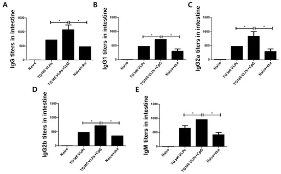 3.5. VLPs Immunizations Showed Parasite-Specific IgG, IgG Subclass, and IgM Antibody Responses in the Intestines