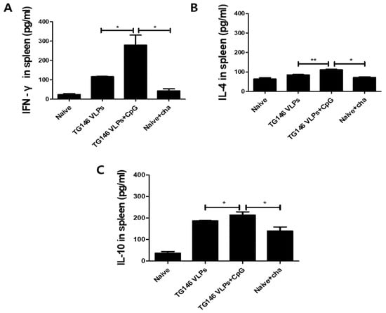 Cellular immunity induction. Mice were immunized with VLPs with or without adjuvant and challenge-infected with T. gondii (ME49). Th1-like cytokine IFN-γ (A) and Th2-like cytokines IL-4 (B) and IL-10 (C) in the spleen were determined to assess cellular immunity. As seen in Figure 6, adjuvanted VLPs immunization induced higher levels of cytokines IFN-γ, IL-4 and IL-10 compared to unadjuvanted VLPs. Data are expressed as mean ± SD and statistical significance is denoted using asterisks (* p < 0.05, ** p < 0.01).