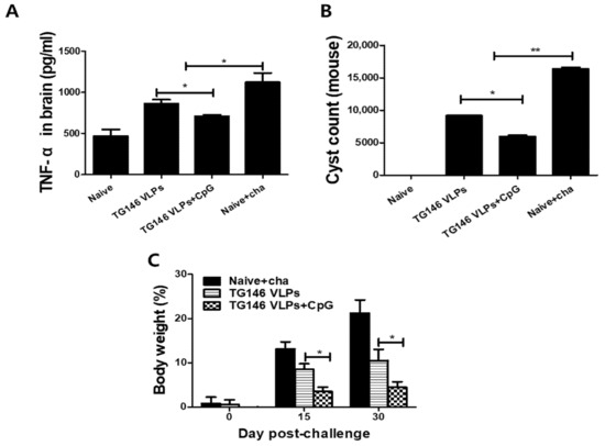 VLP immunizations with or without adjuvant CpG showed significantly lower levels of inflammatory cytokine TNF-α in the brain upon challenge infection compared to the unimmunized naïve control (Naïve+cha). Importantly, the adjuvanted VLPs showed significantly lower levels of TNF-α response compared to the unadjuvanted VLPs (Figure 7A). T. gondii ME49 cysts were counted from the brains of mice under the microscope in order to compare the protective efficacies of the unadjuvanted and adjuvanted VLP vaccines. As seen in Figure 5B, the adjuvanted VLPs showed much lower cyst counts in the brain compared to unadjuvanted VLPs, indicating that the CpG ODN adjuvant contributed to the protection. Additionally, immunization with adjuvanted VLPs incurred lesser bodyweight loss than the unadjuvanted VLPs (Figure 7C).