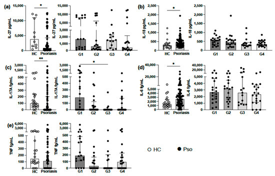 Circulating levels of proinflammatory cytokines in psoriasis. (a) Decreased levels of IL-27 in psoriasis (Pso, n = 75) compared to healthy controls (HC, n = 10). There was no statistical difference between Pso groups. G1 showed more prominent alterations. (b–e) Increased levels of IL-18, IL-17A, IL-6 and TNF in Pso group (n = 75) compared to HC (n = 20). When analyzing cytokines levels in Pso groups, we detected increased levels of IL-17A in G1 (c). G1—biologics treatment; G2—methotrexate treatment; G3—topical treatment; G4—acitretin treatment. Lines represent medians with the interquartile range of cytokine levels expressed. * p < 0.05, ** p < 0.01.