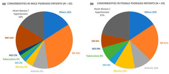 Comorbidities and psoriasis patients. Graphic illustration of main comorbidities reported by male (n = 32) (a) and female (n = 43) (b) Pso patients. DM: diabetes mellitus; HCV: hepatitis C virus infection; HIV: human immunodeficiency virus infection; NR: not related.