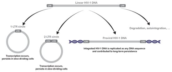 During HIV-1 infection and after retrotranscription of the viral RNA genome, the vast majority of viral double-stranded DNA remains unintegrated, mainly under the form of linear DNAs [,,]. These linear HIV-1 DNA molecules serve as precursors for the integration in the host genome but are also susceptible to multiple other fates (Figure 1) []. Based on the integration event in the host genome, two forms of HIV-1 latency can be distinguished: pre-integration latency and post-integration latency.
