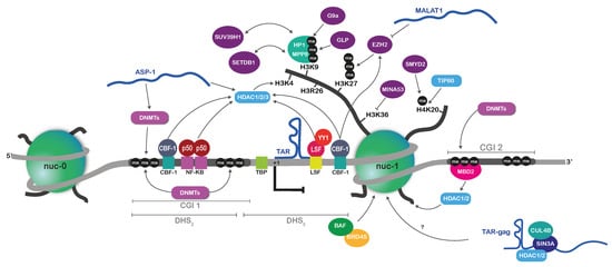Finally, HIV-1 also encodes “lncRNA-like” viral RNAs that act on gene expression and that promote epigenetic silencing of the viral promoter. The role of the HIV-1-encoded antisense RNA ASP-1 in the epigenetic silencing of the 5′LTR was first proposed in a study showing that downregulation of this transcript is associated with decreased recruitment of DNMT3a, HDAC1 and EZH2 to the HIV-1 promoter (Figure 2) []. Recently, it was further shown that the ASP-1 RNA recruits PRC2 to the 5′LTR, thereby provoking H3K27me3, nuc-1 assembly and transcriptional silencing and promoting HIV-1 latency (Figure 2) []. The HIV-1 antisense RNA is thus at the crossroads of multiple epigenetic mechanisms acting in concert to repress the 5′LTR during latency. Another study also showed evidence of a second type of HIV-1-derived RNA in the epigenetic repression of the viral promoter during latency. Indeed, in the presence of external stimuli such as exosomes from uninfected cells, the 5′LTR is only partially silent and the cellular machinery is capable of transcribing through the nucleosomes up to the beginning of the gag gene, between the nucleosomes 2 and 3 []. The resulting TAR-gag ncRNA was further found to be associated with PRC2, SIN3A, HDAC1 and the ubiquitin E3-ligase CUL4B (Figure 2) []. In mammalian cells, SIN3A serves as a co-repressor scaffold through its interaction with both specific transcription factors and histone deacetylases []. The HIV-1 encoded TAR-gag ncRNA might thus function as a cellular lncRNA, by serving as an “RNA machine” that promotes epigenetic silencing of the viral genes, but the specific sequence of mechanisms involved needs to be further investigated.