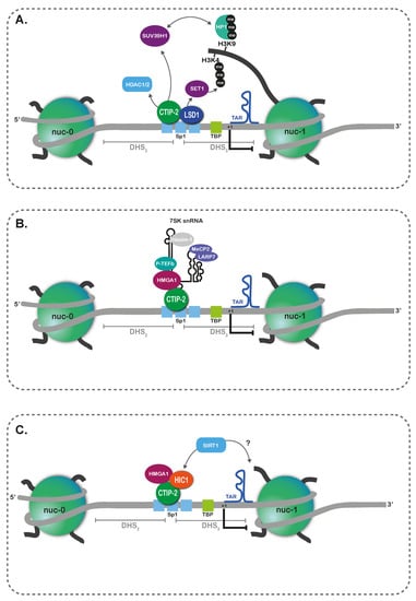CTIP2 (COUP–TF interacting protein 2)/BCL11B is a cellular transcription cofactor that presents pleiotropic functions in HIV-1 gene repression in microglial cells. First, CTIP2 participates in HIV-1 transcriptional repression in microglial cells by recruiting a multi-enzymatic chromatin-modifying complex that establishes a heterochromatic environment at the HIV-1 promoter, in a Tat-independent manner [,] (Figure 3A). Indeed, in these cells, CTIP2 is physically recruited to the HIV-1 promoter by its interaction with Sp1 bound to the GC-boxes of the 5′LTR [], which is made possible by the histone lysine-specific demethylase 1 (LSD1) also bound to the Sp1 sites []. LSD1 recruits the multicomponent COMPASS complex, which ultimately leads to the accumulation of H3K4me3, surprisingly associated with transcriptional repression of the HIV-1 promoter []. In parallel, CTIP2 sequentially recruits HDAC1 and HDAC2 that deacetylate H3, then the histone methyltransferase SUV39H1 that promotes H3K9me3 []. Similarly to T cells [], through its chromodomain, HP1γ recognizes H3K9me3 and further recruits SUV39H1 to spread heterochromatin across the HIV-1 promoter region []. A second mode of HIV-1 gene repression by CTIP2 in microglial cells is through the sequestration of the positive elongation factor b (P-TEFb) cooperatively with HMGA1 (High Mobility Group AT-hook 1) associated with the 7SK small nuclear RNA and HEXIM1 (Figure 3B) [,]. While this repressive mode is not strictu senso an epigenetic mechanism, the regulation of HIV-1 transcription elongation by the cellular ncRNA 7SK could be considered as an RNA-mediated epigenetic mechanism. Finally, the transcription factor HIC1 (Hypermethylated In Cancer 1) interacts physically with CTIP2 and HMGA1 to mediate a third repression mode of the HIV-1 5′LTR in microglial cells (Figure 3C) []. Indeed, HIC1 downregulation has been shown to be associated with a Tat-dependent increase in HIV-1 gene expression in microglial cells, arguing in favor of a repressive function of HIC1 []. Because SIRT1 is a co-repressor of HIC1 [] and a co-activator of Tat [], HIC1 Tat-dependent repression of HIV-1 gene expression could be associated with the HDAC function of SIRT1. Thus far, SIRT1 deacetylation of HIC1 was found to be crucial for its Tat-dependent repression of HIV-1 gene expression. However, in this case, no specific role of SIRT1 in 5′LTR histone status could be shown. Collectively, CTIP2 is implicated in the epigenetic and transcriptional repression of HIV-1 in microglial cells by at least three independent mechanisms. In addition, our laboratory has recently reported that CTIP2 interacts with KAP1/TRIM28 and that these two factors cooperate to repress Tat activity []. As KAP1/TRIM28 has been shown to favor HMT recruitment in CD4+ T cells []; a functional interplay between CTIP2 and KAP1/TRIM28 in the epigenetic control of the 5′LTR in microglial cells is expected but needs to be further studied. In addition, it remains to be determined how CTIP2 can switch from one repressive mode to another and whether CTIP2 mediates similar repression mechanisms in latently infected CD4+ T cells.