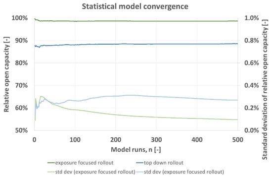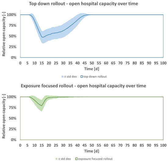 In this hospital model, the expected open hospital capacity which is assumed to maximize patient benefit is generally greater for the exposure focused rollout. The model relies on the drawing of random numbers for e.g., age and transmission events. Building statistical averages for n = 500 model runs ensures convergence of results with a constant, Figure 2. Standard deviation of open hospital capacity calculated over averages of n lies below 0.4%.