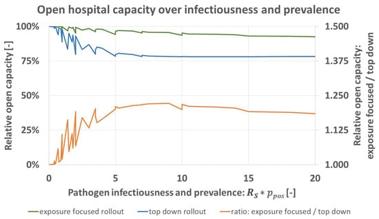 Figure 3 shows the capacity for both rollout schemes for all resulting . The model predicts that for greater disease activity the advantage of the exposure focused rollout increases until a nearly constant level is reached at around 5. At this constant level, predicted open capacity under the exposure focused rollout is about 1.2 times greater than what is predicted for the top down rollout (orange). When disease activity decreases, the advantage of the exposure focused rollout does so as well. Both rollout schemes achieve approximately equal results for .
