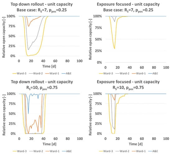 Figure 4 gives information about the influence of disease activity on open status on unit level. The base case scenario (RS = 7, ppos = 0.25, Table 4) leads to a temporary total closure of ward 3 and substantial closures of ward 2 and ward 1 under the top down rollout. The prediction for exposure focused vaccine rollout of the base case predicted a fully open ward 1. Ward 2 and 3 would be expected to lose temporarily capacity, by a margin less than what is predicted for the top down scheme. If disease activity is increased to e.g., (RS = 10, ppos = 0.75) under both rollout schemes open capacity drops. Temporarily, ward 1–3 are predicted closed and A&E predicted not fully open under the top down rollout while A&E is predicted fully open under the exposure focused rollout. Also, the predicted disease spreading pattern between hospital wards is independent of the total staff number. Larger healthcare organizations, be they hospitals or nursing homes, can have multiple subunits between which patients and staff are moving during the day. For modelling that setting, the number of infected, nonsymptomatic colleagues (please see Equations (2) and (3) can be expanded. Irrespectively, the pathogen intake of larger multiclinic hospital organizations will be as modelled here.