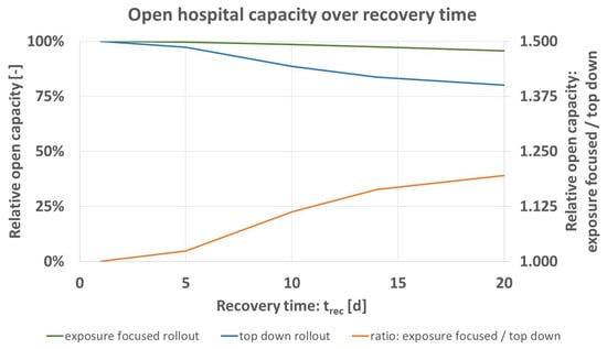 Predicted open hospital capacity over recovery time trec [d] for top down (blue), and exposure focused rollout (green), together with their respective ratio (orange).