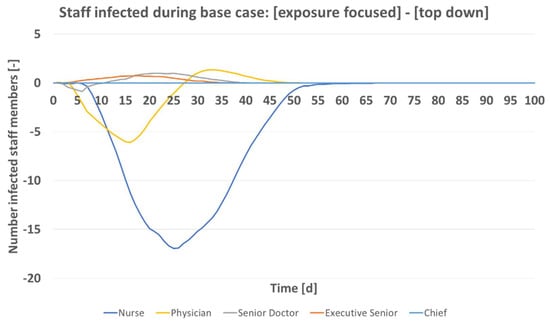 Figure 6 gives the expected number of infected staff over time, top down rollout scheme subtracted from exposure focused rollout. Total numbers are shown by hierarchy group. This analysis is of importance as it relates to work which showed that social factors must be considered during the current pandemic [,,]. The greatest difference between the vaccine rollout schemes is seen for the nursing staff. Their infection numbers are predicted by the model to increase most, once the hierarchical vaccine allocation takes place. Executive seniors and senior doctors are predicted to on average benefit from the top down rollout. The chief who also can work on A&E is vaccinated fairly early in both schemes and not predicted to contract the pathogen. Interestingly, the physicians are treated favorably in each of the two rollout schemes. Depending on progression of the rollout, they benefit or not. Initially, they are worse off as doctors of greater hierarchical rank are assigned vaccine doses. After t of 27 days, their group however benefits from the top down scheme as they are assigned vaccine doses which would go alternatively to A&E nurses under the exposure focused rollout. Total staff size of a hospital does not alter this effect. In considerations for a vaccine rollout in private practices, this finding is of importance as nurses there typically see the same or even greater pathogen exposure than the doctor.