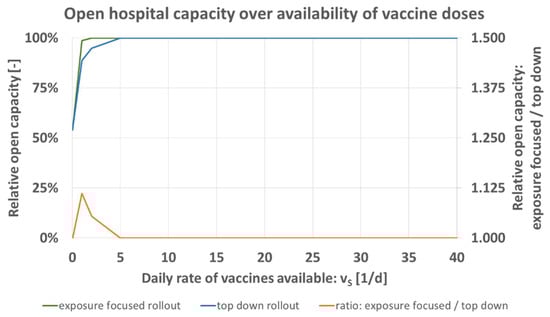 Predicted open hospital capacity over daily rate of vaccines available vS [1/d] for top down (blue), and exposure focused rollout (green), together with their respective ratio (orange).