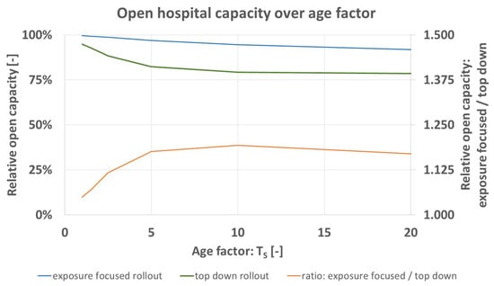 Predicted open hospital capacity over age factor TS [-] for top down (blue), and exposure focused rollout (green), together with their respective ratio (orange).