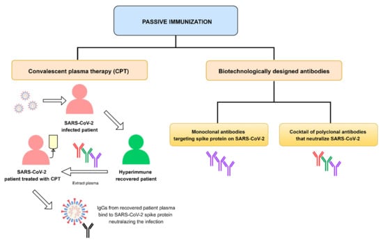One of the strategies considered for defeating COVID-19 is passive immunotherapy (Figure 1). There are two ways to guarantee passive immunization: (i) via natural antibodies using convalescent plasma therapy (CPT) in which plasma is extracted from a hyperimmune patient and transfused into a COVID-19 patient; or (ii) via antibodies that are biotechnologically designed, i.e., therapeutic monoclonal antibodies (mAbs) or a cocktail of polyclonal antibodies (pAbs) [7]. Of these two passive immunization strategies, the use of mAbs offer the most innovative approach to the prevention and treatment of infectious diseases, such as COVID-19, where current research aims at developing treatments based on specific mAbs to block and/or neutralize SARS-CoV-2 in infected patients [8]. In addition, already available mAbs have been used off-label based on the knowledge acquired during the pandemic regarding the pathogenesis of the disease. Therefore, the characteristic of mAbs made them perfectly suitable for the treatment of COVID-19 [9].