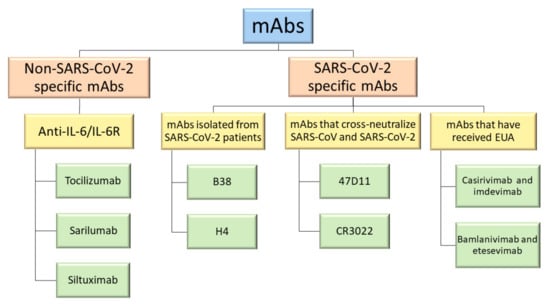 Although mAb production is time-consuming and expensive, especially for use against new pathogens, they have been regarded as a good option for the treatment of COVID-19 since the beginning of the pandemic and many clinical trials on both non- and SARS-CoV-2 specific mAbs are currently ongoing. However, the outcomes of clinical trials for non-SARS-CoV-2 specific mAbs are proving controversial, as their efficacy has yet to be definitively demonstrated, whilst SARS-CoV-2 specific mAbs have demonstrated significant levels of efficacy. So far, two specific mAb-based COVID-19 treatments have received an EUA from the FDA. The first involves combined administration of casirivimab and imdevimab, and the second, combined administration of bamlanivimab and etesevimab. These clinical trials have therefore shown the importance of developing mAbs that are specifically targeted at SARS-CoV-2 rather than those aimed at the COVID-19-associated cytokine storm.