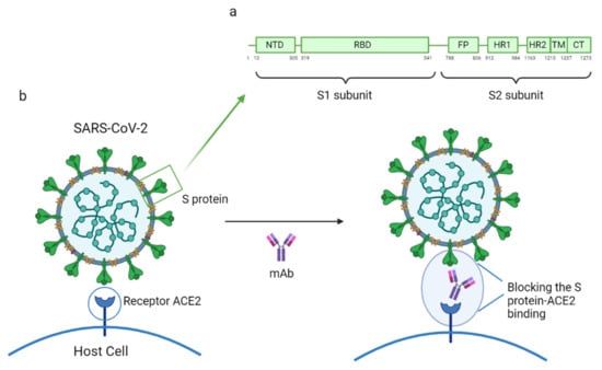 (a) Mechanism of action of a mAb by blocking the SARS-CoV-2 S protein and human ACE2 receptor binding; (b) structure of the SARS-CoV-2 S protein. This figure was composed using BioRender (available at: https://biorender.com/. Accessed on 12 May 2021).