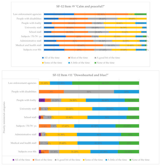 Percentage of response frequencies relative to items #9 and #11 of SF-12 divided by vaccine priority ministerial categories.